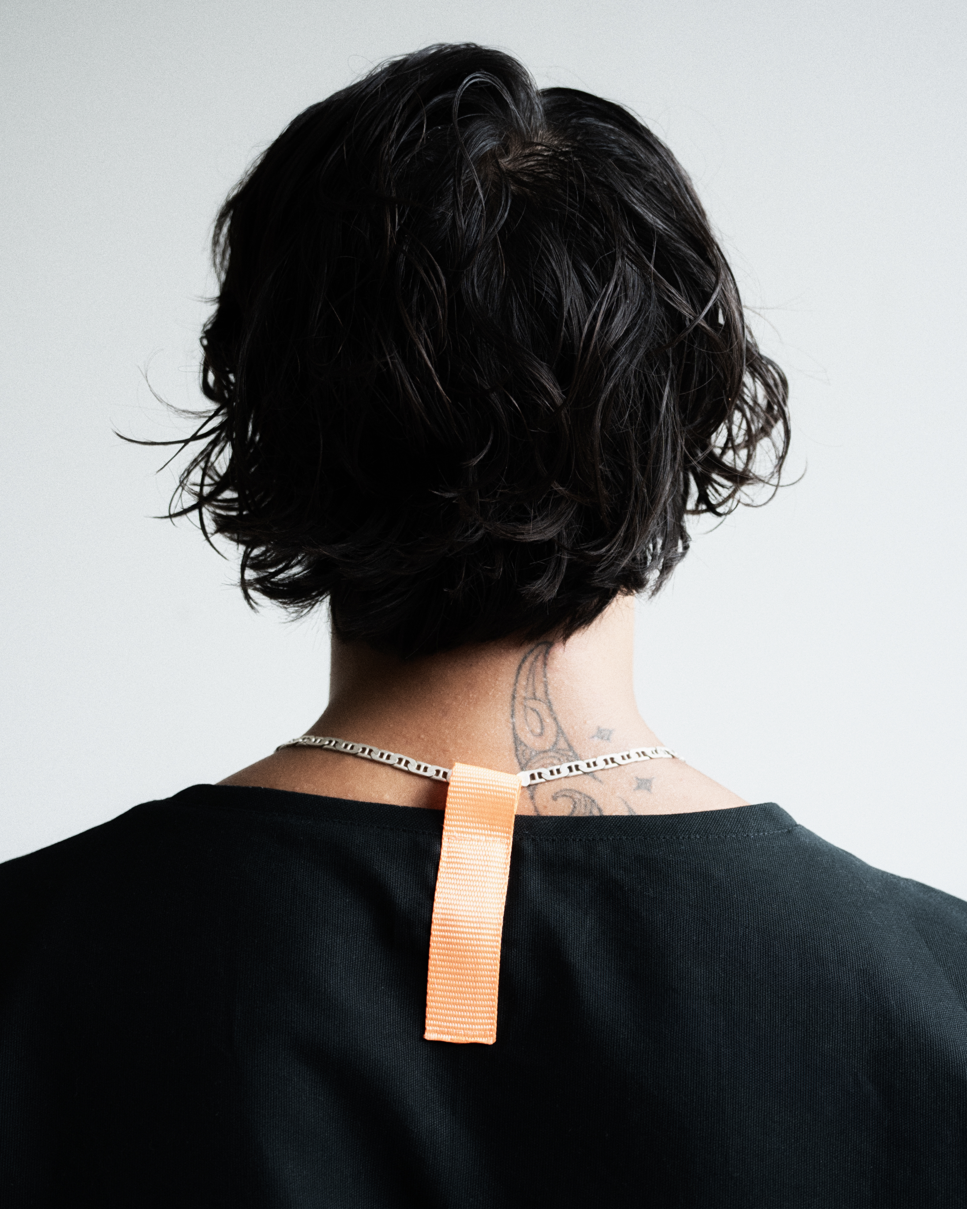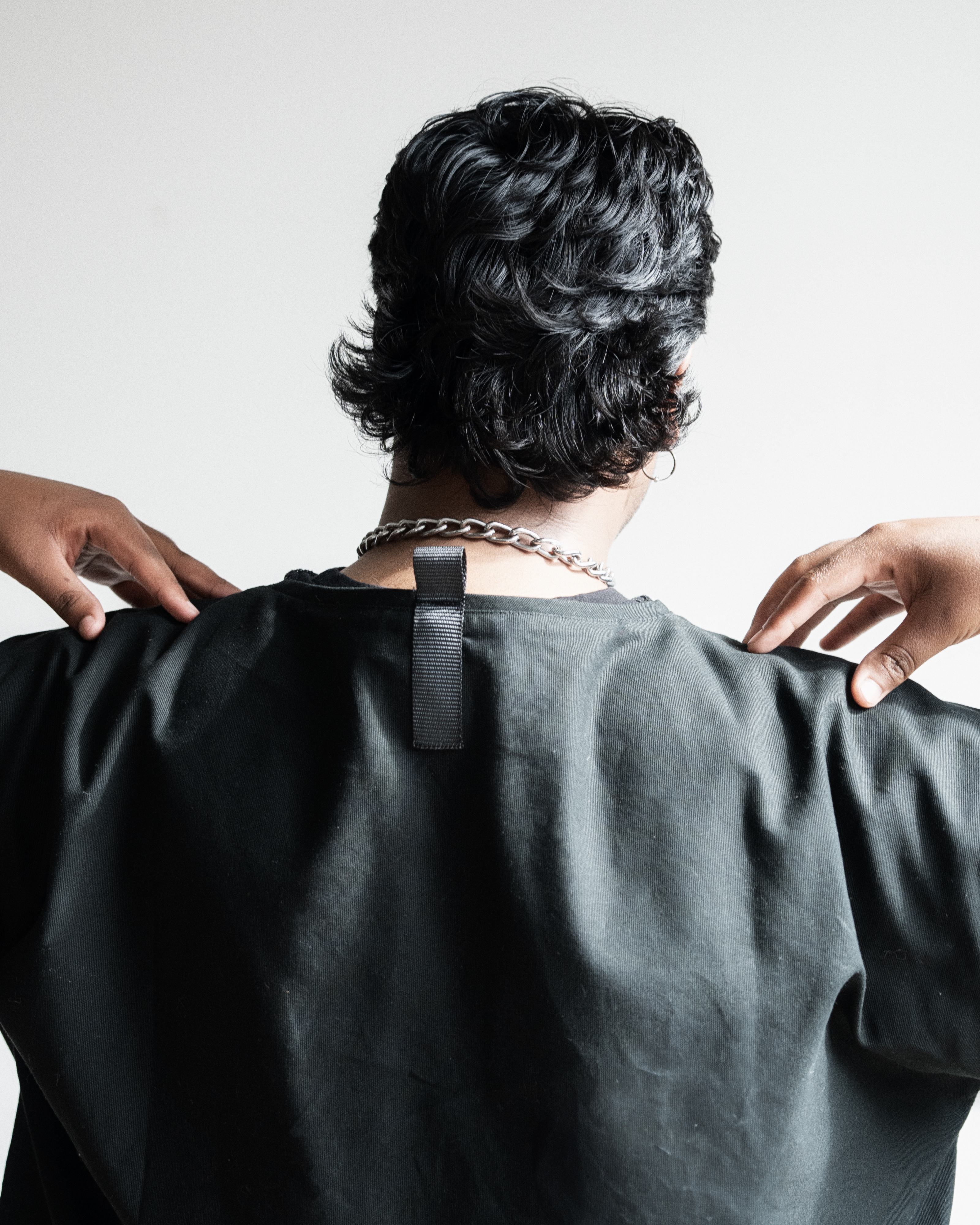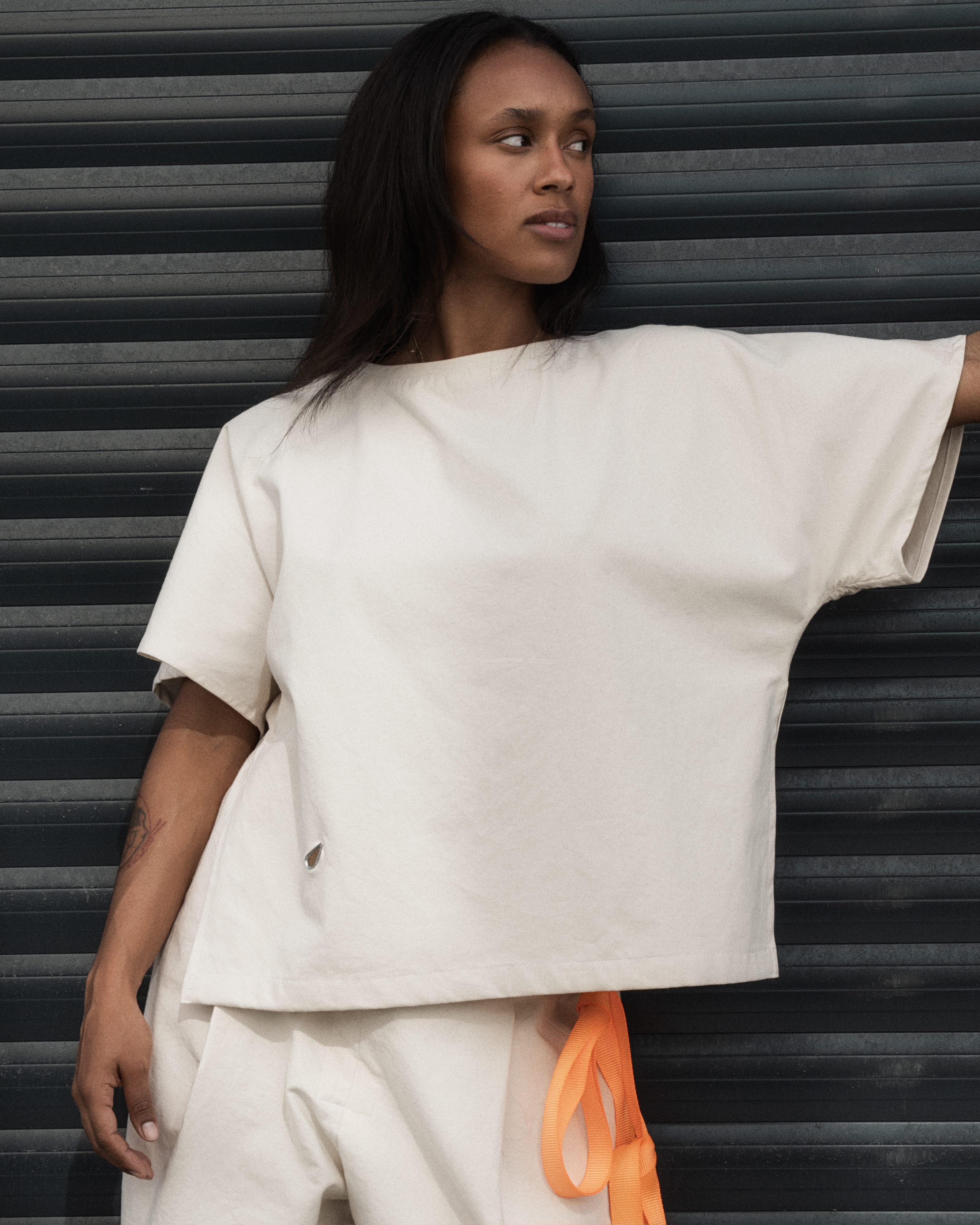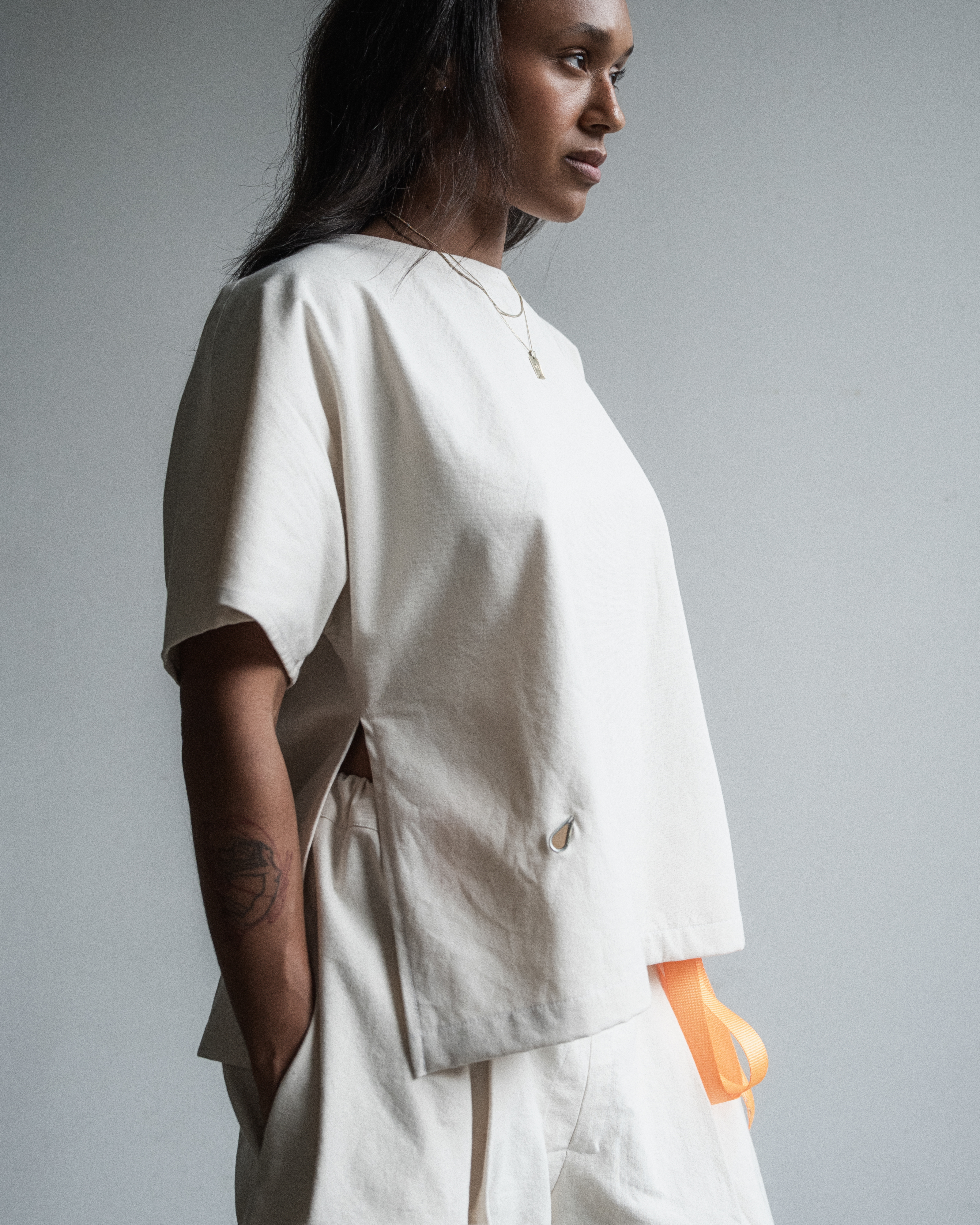gender-neutral, boxy oversized cropped fit, 100% cotton w/ nylon strap,